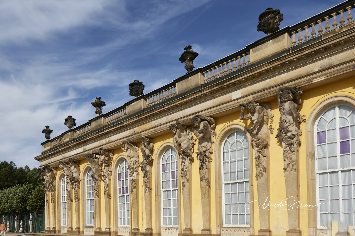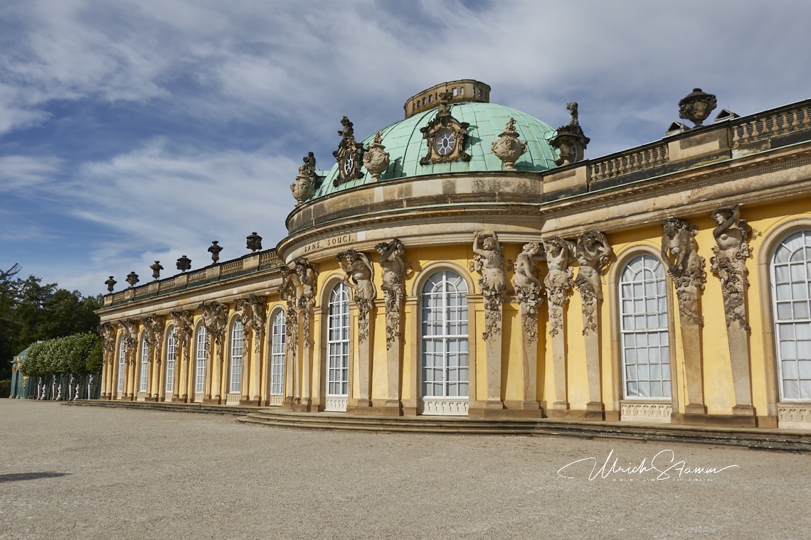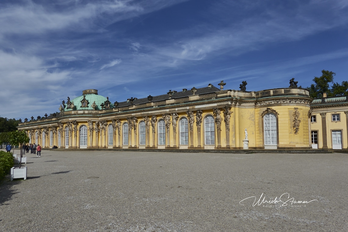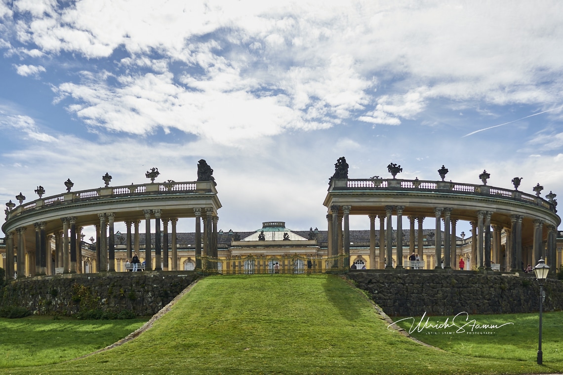 Ein Besuch in Sanssouci beginnt oft am Schlossvorplatz und führt hinunter über die terrassierten Weinberge, vorbei an Spalierobst, historischen Mauern, Zypressen und Orangerien. Die Terrassierung erlaubt Blick über die Stadt Potsdam und in die Landschaft.