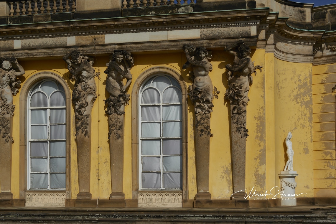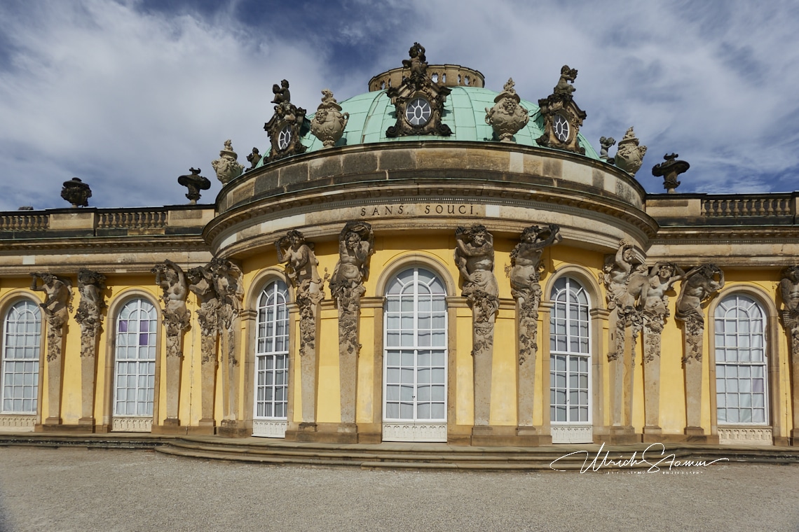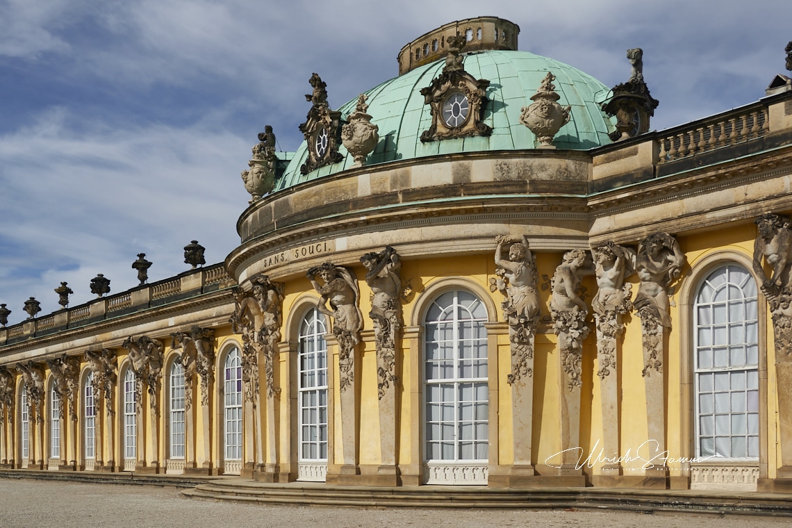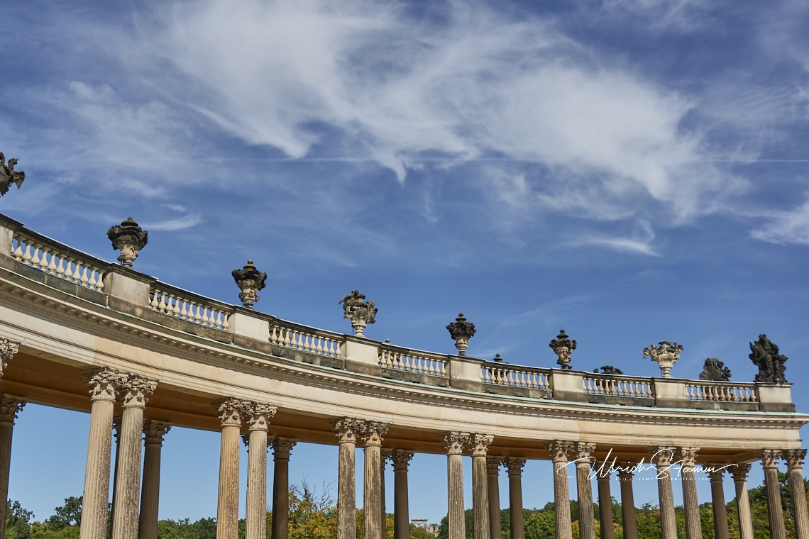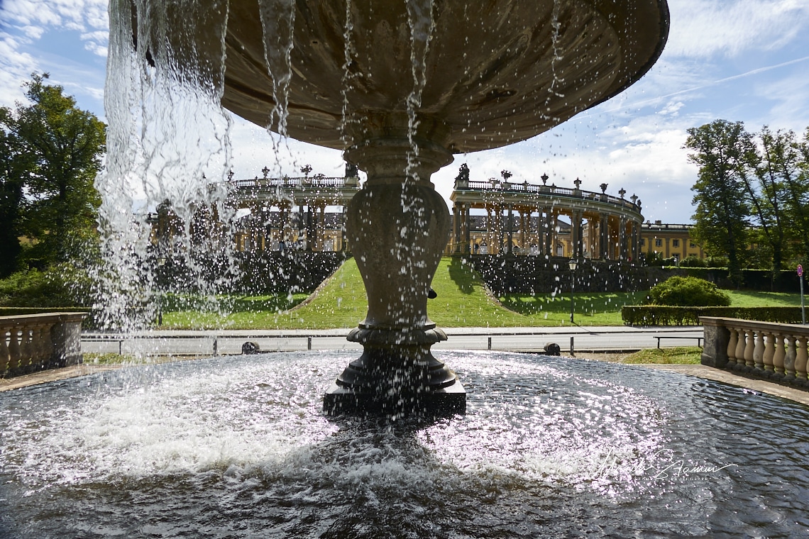 Ein Besuch in Sanssouci beginnt oft am Schlossvorplatz und führt hinunter über die terrassierten Weinberge, vorbei an Spalierobst, historischen Mauern, Zypressen und Orangerien. Die Terrassierung erlaubt Blick über die Stadt Potsdam und in die Landschaft.