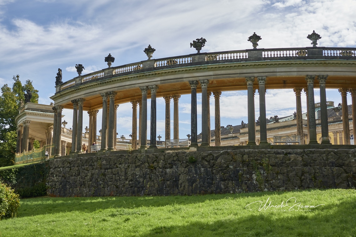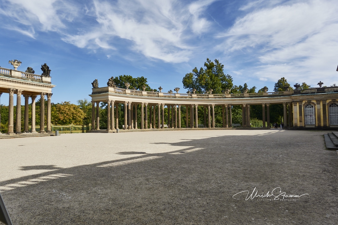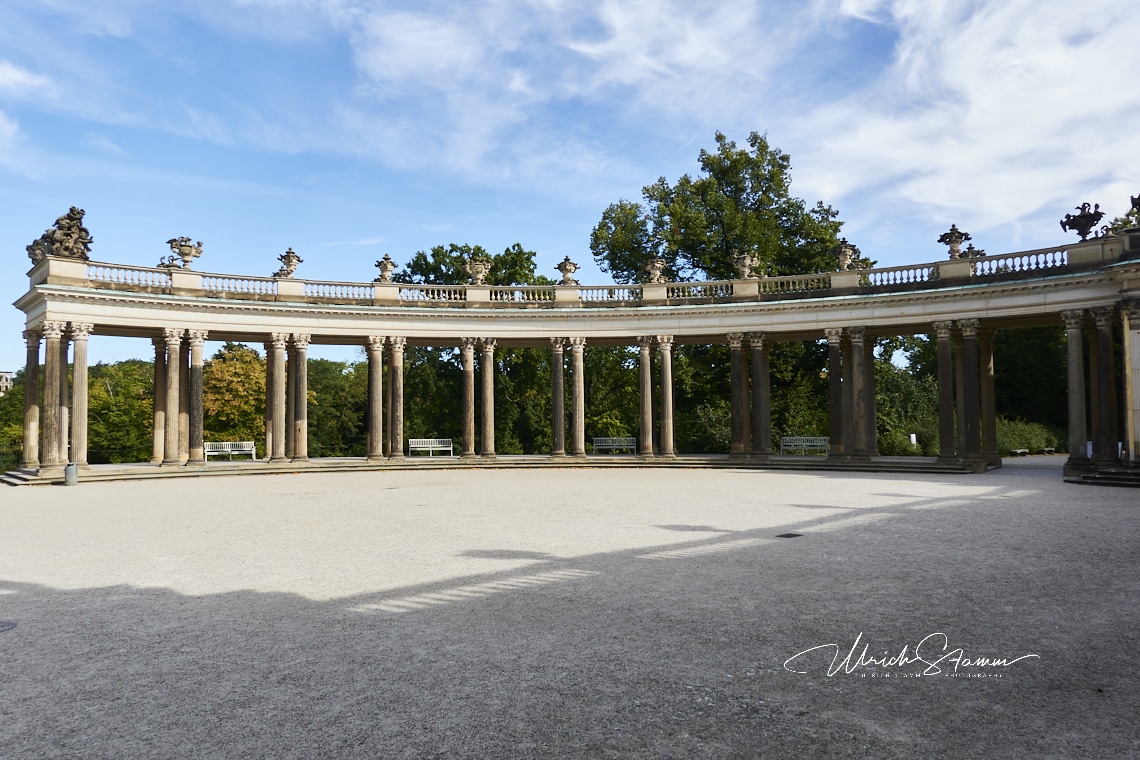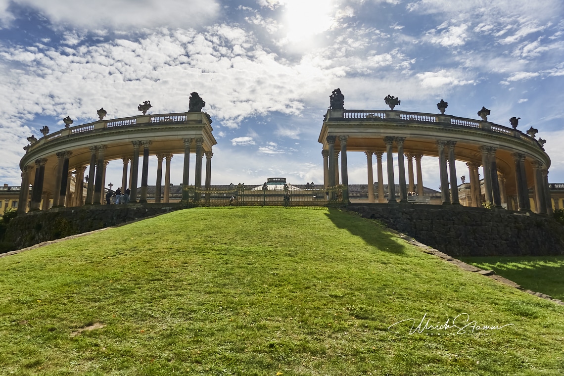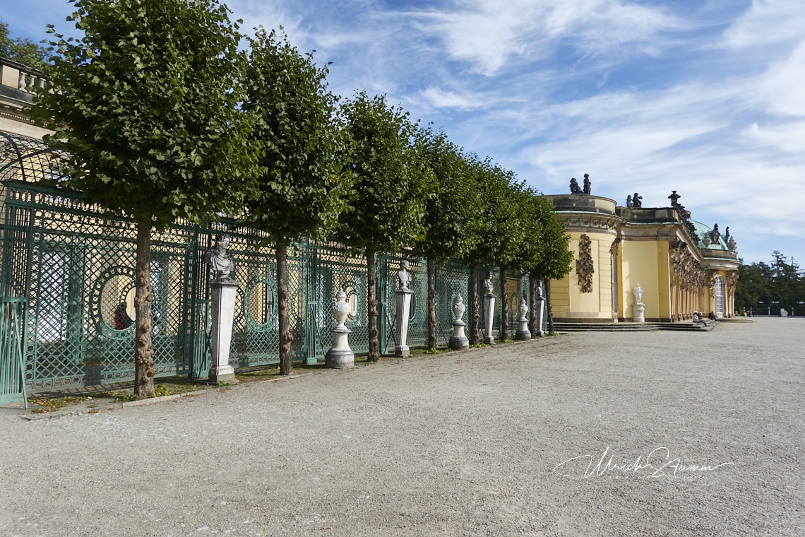 Auch die Wegeführung ist Teil des Konzepts: vom Schloss führen Terrassen abwärts, Grünachsen verlaufen zur Allee Richtung Neues Palais, Sichtachsen eröffnen fernen Bezug zu weiteren Bauwerken.